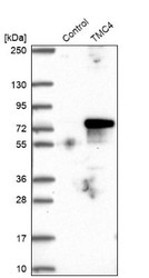 - Western Blot: TMC4 Antibody [NBP2-13437] - Analysis in control (vector only transfected HEK293T lysate) and TMC4 over-expression lysate (Co-expressed with a C-terminal myc-DDK tag (3.1 kDa) in mammalian HEK293T cells).