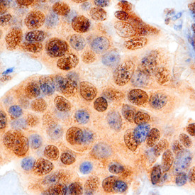 - Cyclin E1 in Human Breast. Cyclin E1 was detected in immersion fixed paraffin-embedded sections of human breast using Mouse Anti-Human Cyclin E1 Monoclonal Antibody (Catalog # MAB6810) at 15 µg/mL overnight at 4 °C. Tissue was stained using the Anti-Mouse HRP-DAB Cell & Tissue Staining Kit (brown; Catalog # CTS002) and counterstained with hematoxylin (blue). Specific staining was localized to epithelial cell nuclei. View our protocol for Chromogenic IHC Staining of Paraffin-embedded Tissue Sections.