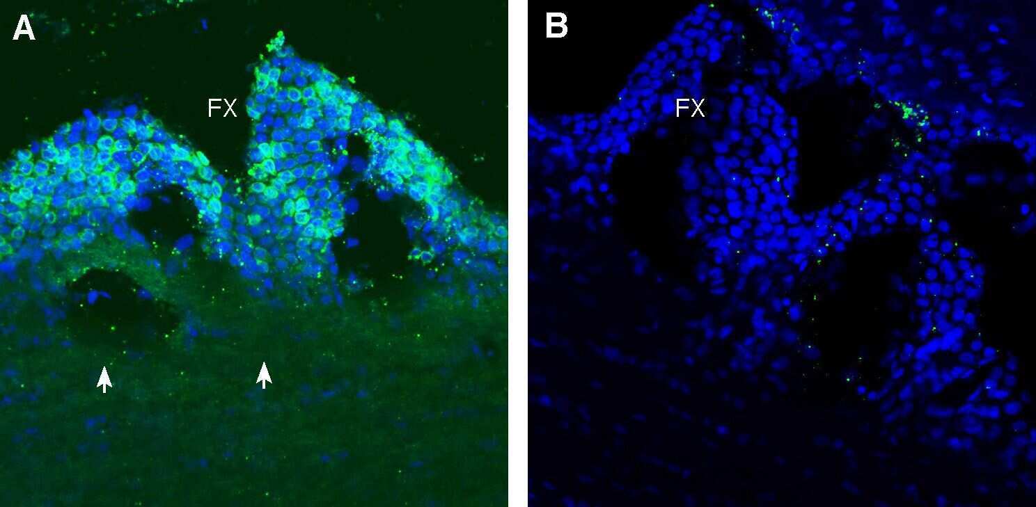 - Expression of PepT2/SLC15A2 in rat subfornical organ. Immunohistochemical staining of perfusion-fixed frozen rat brain sections with Anti-PepT2/SLC15A2 (extracellular) Antibody (#APT-002), (1:100), followed by goat Anti-rabbit-AlexaFluor-488. A. PepT2 immunoreactivity (green) appears in cells of the subfornical organ (arrows). B. Pre-incubation of the Antibody with PepT2/SLC15A2 (extracellular) Blocking Peptide (BLP-PT002), suppressed staining. Cell nuclei are stained with DAPI (blue). FX = fornix.