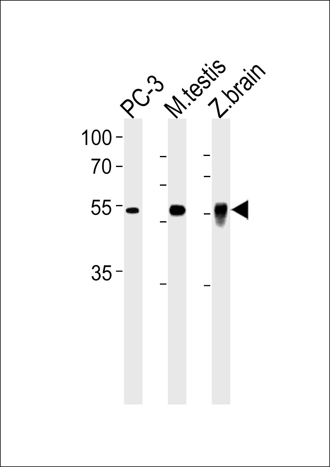 - Western blot analysis of DMRTA2 in zebra fish brain tissue lysates. Samples were incubated with DMRTA2 polyclonal antibody (Product # PA5-35234). Lysates: 35 µg/lane. DMRTA2 protein (arrow).