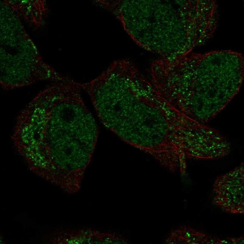 - Immunofluorescent staining of human cell line RH-30 shows localization to nucleoplasm & mitochondria.