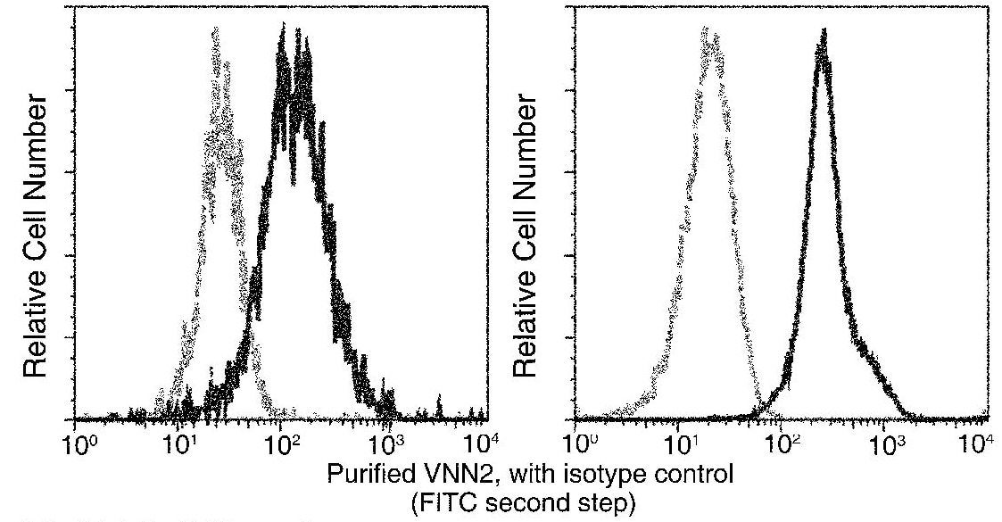 - Flow cytometric analysis of Human VNN2 expression on human whole blood monocytes (left panel) and granulocytes (right panel). Cells were stained with VNN2 Monoclonal Antibody (Product # MA5-29642), then a FITC-conjugated second step antibody. The histograms were derived from gated events with the forward and side light-scatter characteristics of viable monocytes and granulocytes.