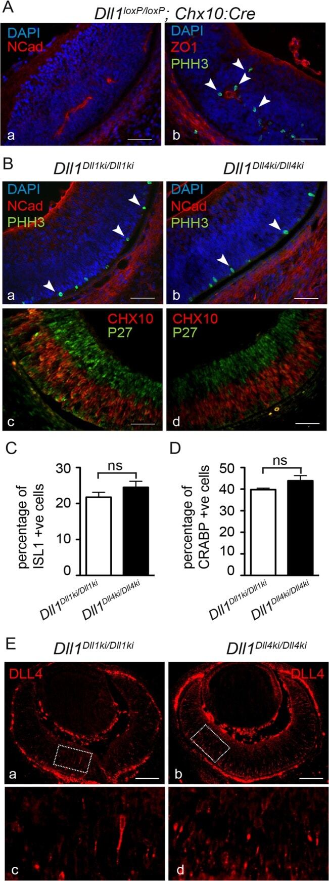 - Fig 4 DLL4 expressed from the Dll1 locus rescues DLL1 loss-of-function in the retina. (A) Dll1 mutant retinas show epithelial disruption with formation of polarised rosettes in which the apical markers N-Cadherin (NCad, a) and ZO-1 (ZO1, b) are abnormally present at the central lumen. Ectopic proliferating progenitors, labelled with PHH3 (b, arrowheads), are located close to the apical lumen of these rosettes. (B) In contrast, the neuroepithelium of homozygous Dll1 Dll1ki and Dll1 Dll4ki embryos is correctly organised without rosettes, and N-Cadherin shows the normal apical localisation close to the retinal pigmented epithelium (a,b). Mitotic progenitors (PHH3+) are only detected at the apical region of the neuroepithelium (a,b arrowheads). A normal stratification of CHX10+ progenitors and P27+ differentiating neurons is also observed (c,d). (C, D) E13.5 homozygous Dll1 Dll1ki and Dll1 Dll4ki retinas show no significant difference in the number of ISL1+ RGCs (C) and CRABP+ amacrine cells (D). Cells immunopositive for Islet-1 and Crabp were counted and related to the total number of cells in the retina (DAPI+). Percentages are shown as mean +- SEM; ns, not significant. (E) Expression of DLL4 in homozygous Dll1 Dll1ki (a,c) and in homozygous Dll1 Dll4ki (b,d) E13.5 retinas as detected by an anti-DLL4 antibody. (c) and (d) are magnifications of (a) and (b), respectively. Endogenous plus transgenic DLL4 is expressed in more cells in Dll1 Dll4ki/Dll4ki as compared to endogeno