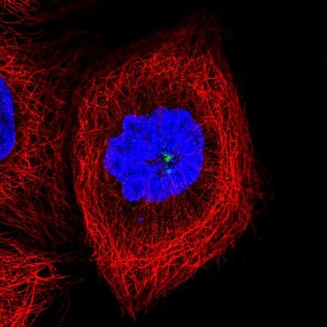 - Immunofluorescent staining of CCDC14 in human cell line A-431 using a CCDC14 Polyclonal Antibody (Product # PA5-57211) shows localization to centrosome.