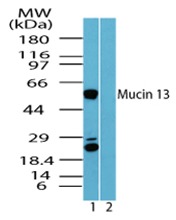 - Western blot analysis of Mucin 13 in human kidney lysate in the 1) absence and 2) presence of immunizing peptide using AP22001PU-N at 0.25 µg/ml.
