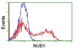 - HEK293T cells transfected with either RC208098 overexpress plasmid (Red) or empty vector control plasmid (Blue) were immunostained by anti-NUB1 antibody (TA800203), and then analyzed by flow cytometry.