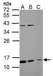 - Sample (30 ug of whole cell lysate) A: A549 B: H1299 C: MCF-7 12% SDS PAGE GTX112010 diluted at 1:1000