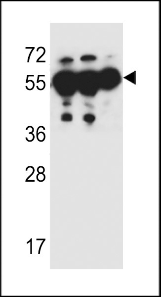 - "ANKRD57 Antibody (C-term) (Cat. #AP5802b) western blot analysis in MDA-MB231,HepG2,A549 cell line lysates (35ug/lane).This demonstrates the ANKRD57 antibody detected the ANKRD57 protein (arrow)."
