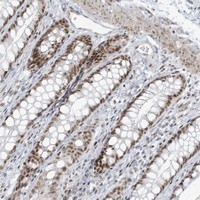 - Immunohistochemical staining of human rectum with ZNF787 polyclonal antibody (Cat # PAB22723) shows moderate nuclear positivity in glandular cells at 1:200-1:500 dilution.