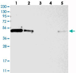 - Western blot analysis of Lane 1: RT-4, Lane 2: U-251 MG, Lane 3: Human Plasma, Lane 4: Liver, Lane 5: Tonsil with ZNF787 polyclonal antibody (Cat # PAB22723) at 1:250-1:500 dilution.