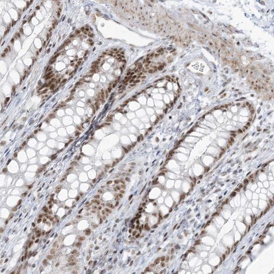 - Immunohistochemistry-Paraffin: ZNF787 Antibody [NBP1-85911] - Staining of human rectum shows moderate nuclear positivity in glandular cells.