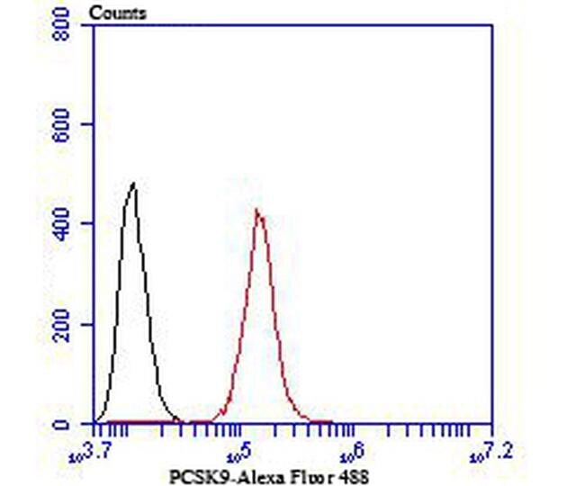 - Flow Cytometric analysis of PCSK9 in Hela cells using a PCSK9 Monoclonal Antibody (Product # MA5-32843) at a dilution of 1:100, as seen in red compared with an unlabelled control (cells without incubation with primary antibody; black). Alexa Fluor 488-conjugated Goat anti mouse IgG was used as the secondary antibody.
