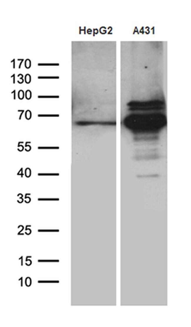 - Western blot analysis of extracts (35 µg) from 2 different cell lines by using anti-PCSK9 monoclonal antibody. (1:500)