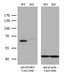 - Equivalent amounts of cell lysates (10 µg per lane) of wild-type Hela cells (WT, Cat# LC810HELA) and PCSK9-Knockout Hela cells (KO, Cat# LC810408) were separated by SDS-PAGE and immunoblotted with anti-PCSK9 monoclonal antibody TA811840. Then the blotted membrane was stripped and reprobed with anti-beta-actin antibody (TA811000) as a loading control. (1:500)