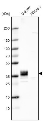 - Western Blot: PPAP2B Antibody [NBP2-57350] - Analysis in human cell line U-2197 and human cell line HDLM-2.