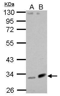 - Western Blot using Fibulin 7 Polyclonal Antibody (Product # PA5-32125). Sample (30 µg of whole cell lysate). Lane A: HCT116. Lane B: MCF-7. 10% SDS PAGE. Fibulin 7 Polyclonal Antibody (Product # PA5-32125) diluted at 1:5,000.