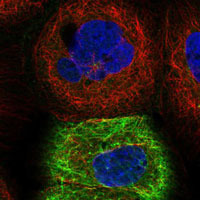 - Immunofluorescent staining of human cell line A-431 with TACSTD2 polyclonal antibody (Cat # PAB28105) at 1-4 ug/mL dilution shows positivity in cytoskeleton (intermediate filaments).