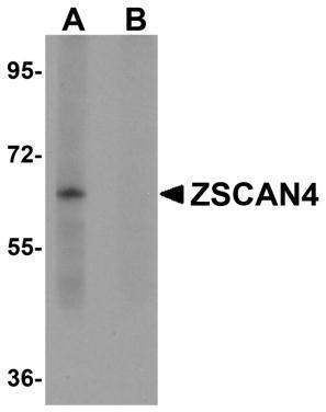 - Western blot analysis of ZSCAN4 in mouse lung tissue lysate with ZSCAN4 antibody in (A) the absence and (B) presence of peptide blocking.
