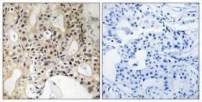 - Immunohistochemistry analysis of paraffin-embedded human breast carcinoma tissue, using LATS1/2 (Ab-1079/1041) Antibody. The picture on the right is treated with the synthesized peptide.
