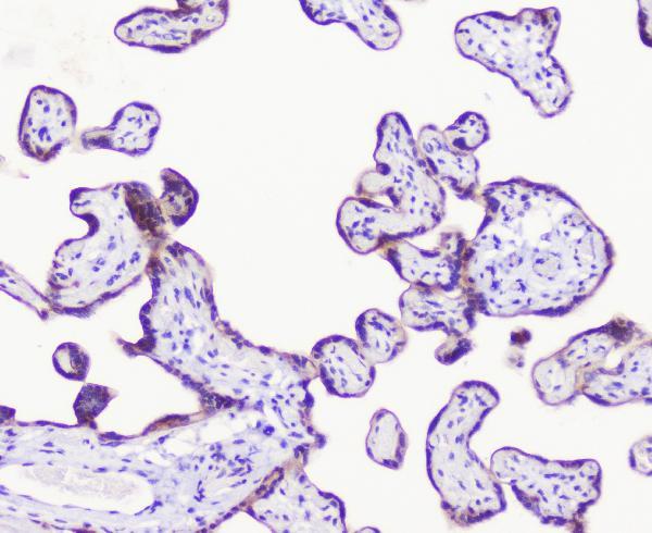 - IHC analysis of LATS1 1using anti-LATS1 antibody (A01051-2).LATS1 was detected in paraffin-embedded section of human placenta tissue. Heat mediated antigen retrieval was performed in citrate buffer (pH6, epitope retrieval solution) for 20 mins. The tissue section was blocked with 10% goat serum. The tissue section was then incubated with 1μg/ml rabbit anti-LATS1 Antibody (A01051-2) overnight at 4°C. Biotinylated goat anti-rabbit IgG was used as secondary antibody and incubated for 30 minutes at 37°C. The tissue section was developed using Strepavidin-Biotin-Complex (SABC)(Catalog # SA1022) with DAB as the chromogen.