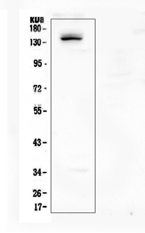 - Western blot analysis of LATS1 in Lane 1: human K562 whole cell lysate. Electrophoresis was performed with 5-20% SDS-PAGE gel (70V, Stacking gel; 90V Resolving gel, Time: 2-3 hours), transferred to a nitrocellulose membrane and blocked using 5% Non-fat Milk/TBS (1.5 hrs at room temperature). Samples were incubated with LATS1 polyclonal antibody (Product # PA5-95564) using a 0.5 µg/mL dilution, followed by a goat anti-rabbit IgG-HRP at a dilution of 1:10,000, and developed with enhanced chemiluminescence (ECL).