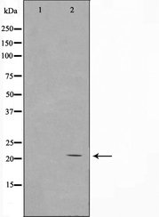 - Western blot analysis on COS7 cell lysates using Histone H1 antibody. The lane on the left is treated with the antigen-specific peptide.