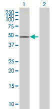 - Western Blot analysis of ZNF776 expression in transfected 293T cell line (H00284309-T01) by ZNF776 MaxPab polyclonal antibody.Lane 1: FLJ38288 transfected lysate(52.36 KDa).Lane 2: Non-transfected lysate.