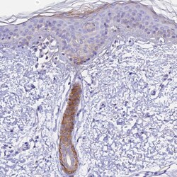- Immunohistochemical staining of COL6A5 in human skin using a COL6A5 Polyclonal Antibody (Product # PA5-60254) shows moderate positivity in hair follicle and a subset of kerationocytes.