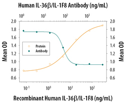 - Cell IL-8 Secretion Induced by IL-36 beta/IL-1F8 and Neutral-ization by Human IL-36 beta/ IL-1F8 Antibody. Recombinant Human IL-36 beta/ IL-1F8 (aa 5-157) (Catalog # 6834-IL) induces IL-8 secretion in human pre-adipocytes in a dose-dependent manner (orange line). IL-8 Secretion elicited by Recombinant Human IL-36 beta/ IL-1F8 (aa 5-157) (20 ng/mL) is neutralized (green line) by increasing concentrations of Goat Anti-Human IL-36 beta/IL-1F8 Antigen Affinity-purified Polyclonal Antibody (Catalog # AF1099). The ND50 is typically 50-300 ng/mL.