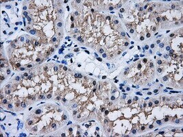 - Immunohistochemical staining of paraffin-embedded Kidney tissue within the normal limits using anti-AKR1A1mouse monoclonal antibody. (Heat-induced epitope retrieval by 10mM citric buffer, pH6.0, 100°C for 10min, TA500741, Dilution 1:50)