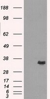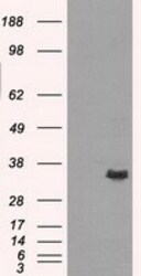 - HEK293T cells were transfected with the pCMV6-ENTRY control (Left lane) or pCMV6-ENTRY AKR1A1 (RC200302, Right lane) cDNA for 48 hrs and lysed. Equivalent amounts of cell lysates (5 µg per lane) were separated by SDS-PAGE and immunoblotted with anti-AKR1A. Positive lysates LY401826 (100 µg) and LC401826 (20 µg) can be purchased separately from OriGene.