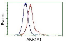 - Flow cytometric analysis of Hela cells, using anti-AKR1A1 antibody (TA500741), (Red) compared to a nonspecific negative control antibody (TA50011)(Blue).