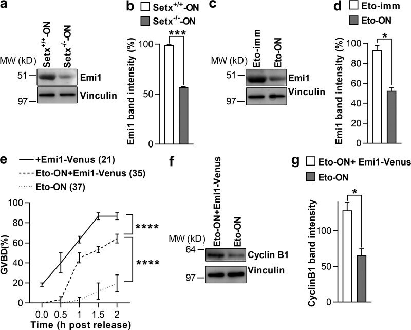 - Figure 7. Reduced Emi1 levels inhibit M-phase entry following DNA damage. (a and b) Representative immunoblot (a) and quantification of Emi1 band intensities (b) in Setx +/+ -ON and Setx -/- -ON oocytes (50 oocytes per lane). (c and d) Representative immunoblot (c) and quantification of Emi1 band intensities (d) in Eto-immediate and Eto-ON oocytes (50 oocytes per lane). (e) GVBD rates for oocytes microinjected with EMI1-Venus cRNA, Eto-ON oocytes microinjected with EMI1-Venus cRNA, and uninjected Eto-ON oocytes. Note that ~20% of oocytes overexpressing Emi1-Venus overcame IBMX-mediated inhibition. ( f and g ) Representative immunoblot (f) and quantification of cyclin B1 band intensities (g) in Eto-ON oocytes with or without Emi1-venus overexpression (80 oocytes per lane). Oocyte numbers are shown in parentheses from a minimum of three independent experiments. Error bars are mean +- SEM. Two-tailed Student's t test (b, d, and g) or two-way ANOVA (e) was used for statistical analysis. *, P < 0.05; ***, P < 0.001; ****, P < 0.0001. In immunoblots, vinculin served as loading control.