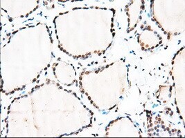 - Immunohistochemical staining of paraffin-embedded human thyroid tissue within the normal limits using anti-MTRF1L mouse monoclonal antibody. (Heat-induced epitope retrieval by 10mM citric buffer, pH6.0, 100°C for 10min, TA501067, Dilution 1:50)