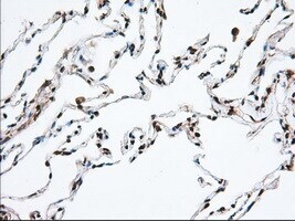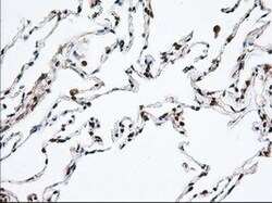 - Immunohistochemical staining of paraffin-embedded human lung tissue within the normal limits using anti-MTRF1L mouse monoclonal antibody. (Heat-induced epitope retrieval by 10mM citric buffer, pH6.0, 100°C for 10min, TA501067, Dilution 1:50)