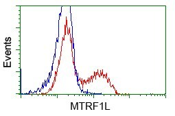 - HEK293T cells transfected with either RC204221 overexpress plasmid (Red) or empty vector control plasmid (Blue) were immunostained by anti-MTRF1L antibody (TA501067), and then analyzed by flow cytometry.