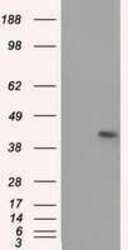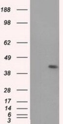 - HEK293T cells were transfected with the pCMV6-ENTRY control (Left lane) or pCMV6-ENTRY MTRF1L (RC204221, Right lane) cDNA for 48 hrs and lysed. Equivalent amounts of cell lysates (5 µg per lane) were separated by SDS-PAGE and immunoblotted with anti-MTRF1. Positive lysates LY402734 (100 µg) and LC402734 (20 µg) can be purchased separately from OriGene.