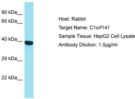 - Host: Rabbit; Target Name: C1orf141; Sample Tissue: HepG2 Whole Cell lysates; Antibody Dilution: 1.0 ug/ml