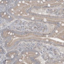 - Immunohistochemical staining of human duodenum with C1orf141 polyclonal antibody (Cat # PAB22719) shows moderate cytoplasmic positivity in glandular cells at 1:10-1:20 dilution.