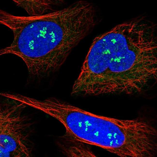 - Immunofluorescent staining of PPP2R3A in human cell line U-2 OS shows positivity in nucleoli. Samples were probed using a PPP2R3A Polyclonal Antibody (Product # PA5-57415).