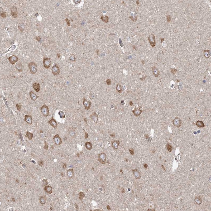 - Immunohistochemical analysis of PPP2R3A in human hippocampus using PPP2R3A Polyclonal Antibody (Product # PA5-57415) shows moderate cytoplasmic positivity in neuronal cells.