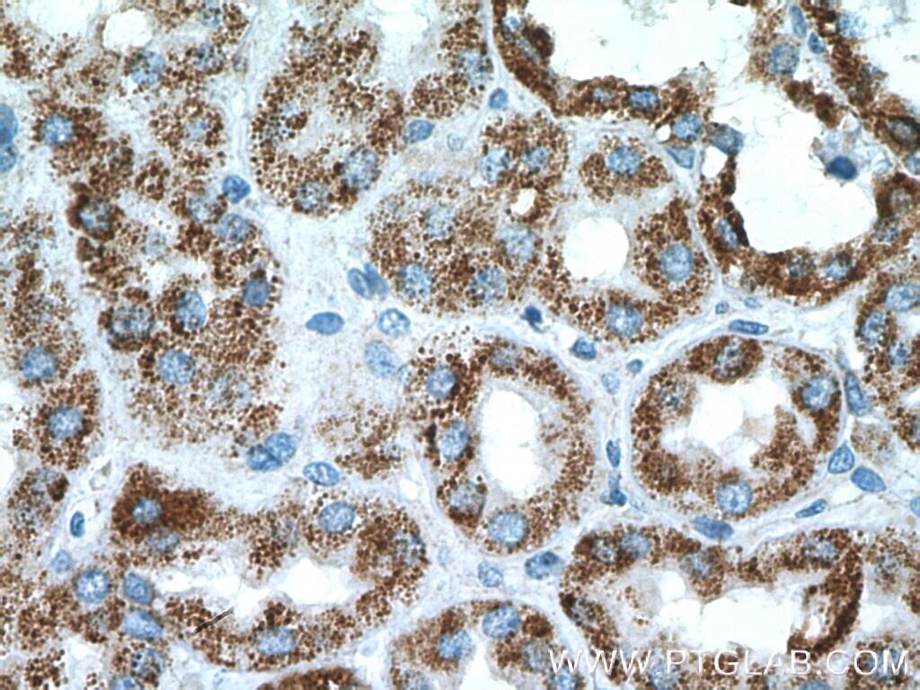 - Immunohistochemistry of paraffin-embedded human kidney tissue slide using 11139-1-AP ( PCCB Antibody) at dilution of 1:200 (under 40x lens).