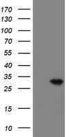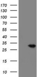 - HEK293T cells were transfected with the pCMV6-ENTRY control (Left lane) or pCMV6-ENTRY VBP1 (RC208482, Right lane) cDNA for 48 hrs and lysed. Equivalent amounts of cell lysates (5 µg per lane) were separated by SDS-PAGE and immunoblotted with anti-VBP1. Positive lysates LY418727 (100 µg) and LC418727 (20 µg) can be purchased separately from OriGene.