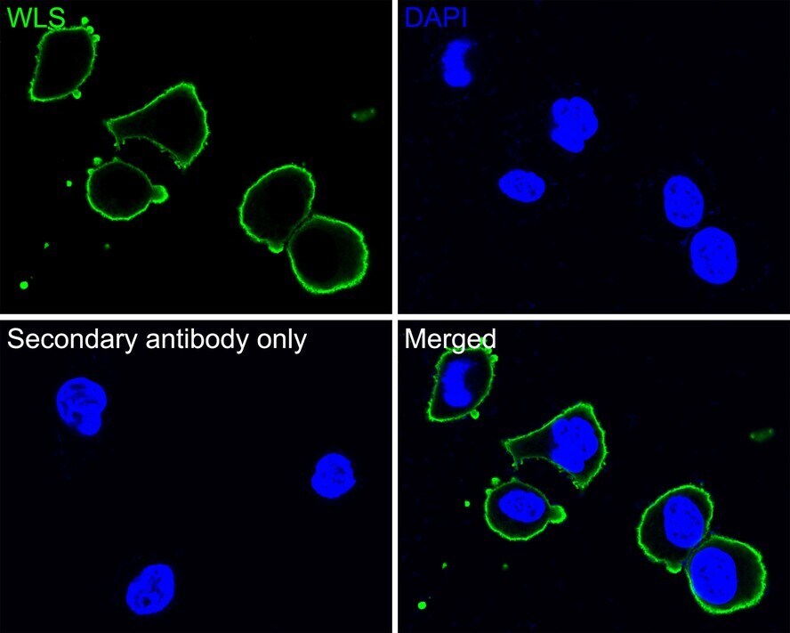 - Immunocytochemistry analysis of WLS in SH-SY5Y cells. Cells were fixed in 4% paraformaldehyde for 30 minutes, permeabilized with 0.1% Triton X-100 in PBS for 15 minutes, and then blocked with 2% BSA for 30 minutes at room temperature. Samples were incubated in WLS Monoclonal antibody (Product # MA5-44978) using a dilution of 1:100 in 2% BSA overnight at 4 ℃ followed by Goat Anti-Mouse IgG H&L (iFluor™ 488) secondary antibody at a dilution of 1:1,000. PBS instead of the primary antibody was used as the secondary antibody only control. Nuclear DNA was labelled in blue with DAPI.
