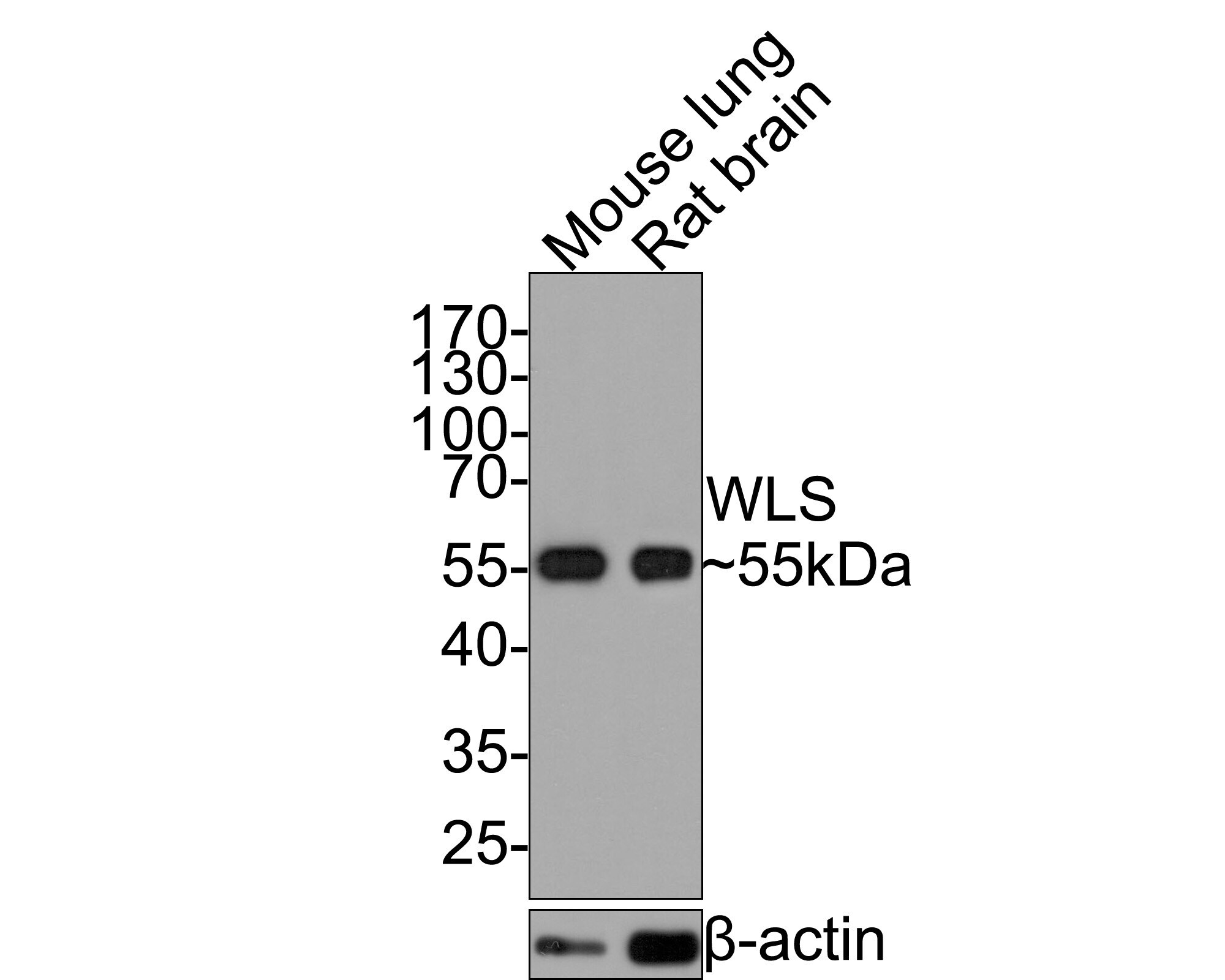 - Western blot analysis of WLS in different lysates (20 µg/Lane). Exposure time: 30 seconds; 10% SDS-PAGE gel. Proteins were transferred to a PVDF membrane and blocked with 5% NFDM/TBST for 1 hour at room temperature. Samples were incubated in WLS Monoclonal antibody (Product # MA5-44978) using a dilution of 1:5,000 in 5% NFDM/TBST at room temperature for 2 hours followed by Goat Anti-Mouse IgG - HRP secondary antibody at a dilution of 1:100,000 for 1 hour at room temperature. Lane 1: Mouse lung tissue lysate; Lane 2: Rat brain tissue lysate. Predicted band size: 62 kDa. Observed band size: 55 kDa.
