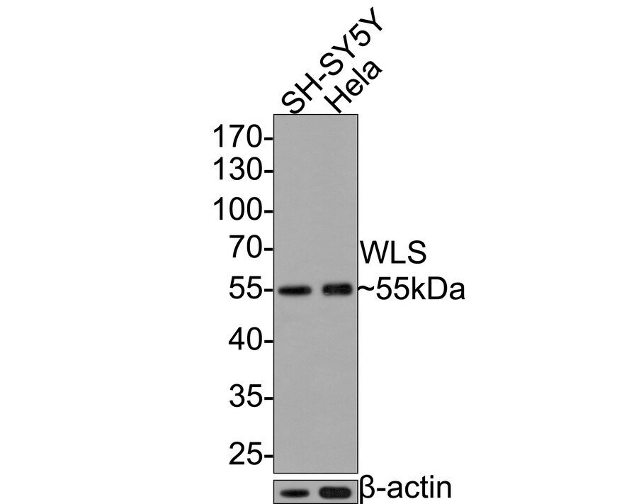 - Western blot analysis of WLS in different lysates (10 µg/Lane). Exposure time: 30 seconds; 10% SDS-PAGE gel. Proteins were transferred to a PVDF membrane and blocked with 5% NFDM/TBST for 1 hour at room temperature. Samples were incubated in WLS Monoclonal antibody (Product # MA5-44978) using a dilution of 1:20,000 in 5% NFDM/TBST at room temperature for 2 hours followed by Goat Anti-Mouse IgG - HRP secondary antibody at a dilution of 1:100,000 for 1 hour at room temperature. Lane 1: SH-SY5Y cell lysate; Lane 2: Hela cell lysate. Predicted band size: 62 kDa. Observed band size: 55 kDa.