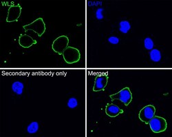 - Immunocytochemistry analysis of WLS in HeLa cells. Cells were fixed in 4% paraformaldehyde for 30 minutes, permeabilized with 0.1% Triton X-100 in PBS for 15 minutes, and then blocked with 2% BSA for 30 minutes at room temperature. Samples were incubated in WLS Monoclonal antibody (Product # MA5-44978) using a dilution of 1:100 in 2% BSA overnight at 4 ℃ followed by Goat Anti-Mouse IgG H&L (iFluor™ 488) secondary antibody at a dilution of 1:1,000. PBS instead of the primary antibody was used as the secondary antibody only control. Nuclear DNA was labelled in blue with DAPI.