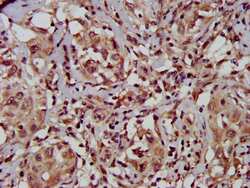 - Immunohistochemical analysis of TFB1M in paraffin embedded human liver cancer using a TFB1M polyclonal antibody (Product # PA5-98190) at a dilution of 1:500. After dewaxing and hydration, antigen retrieval was mediated by high pressure in a citrate buffer (pH 6.0). Section was blocked with 10% normal goat serum 30min at RT. Then primary antibody (1% BSA) was incubated at 4°C overnight. The primary is detected by a biotinylated secondary antibody and visualized using an HRP conjugated SP system.