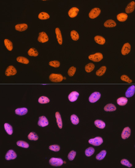 - Immunofluorescence analysis of U-2 OS cells using RBBP4 rabbit monoclonal antibody (STJ11101914) at dilution of 1:100 (40x lens). Blue: DAPI for nuclear staining.