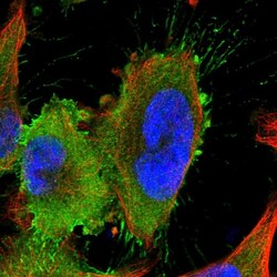 - Immunofluorecent analysis of LRRIQ3 in human cell line U-251 MG using LRRIQ3 Polyclonal Antibody (Product # PA5-56562). Staining shows localization to plasma membrane.